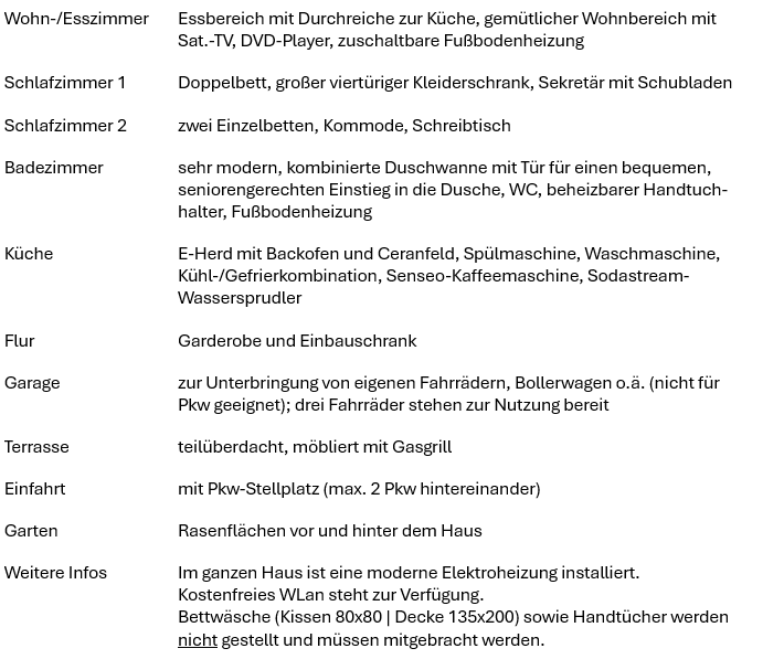 Es handelt sich um einen freistehenden, lichtdurchfluteten Nichtraucher-Bungalow mit einem schön angelegten, ca. 400m² großen Garten.